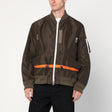Sacai jacket in khaki nylon twill, characterized by a front closure with a visible double zip, long sleeves, one of which has an applied zip pocket, ribbed knit edges, and a contrasting waistband with adjustable drawstring.