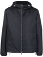 navy blue monogram jacquard logo-engraved silver-tone hardware drawstring hood front two-way zip fastening long sleeves elasticated cuffs straight hem Nylon blouson jacket