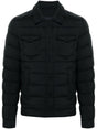 black goose down padded design insulated design classic hood long sleeves two chest flap pockets two front welt pockets waist tabs straight hem internal slip pocket full lining front press-stud and zip fastening La Denim nylon jacket