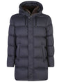 navy blue down-feather filling padded design logo plaque drawstring hood concealed front fastening long sleeves two front welt pockets Arendelle down jacket