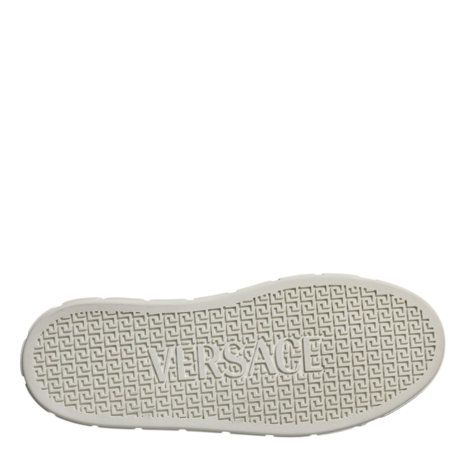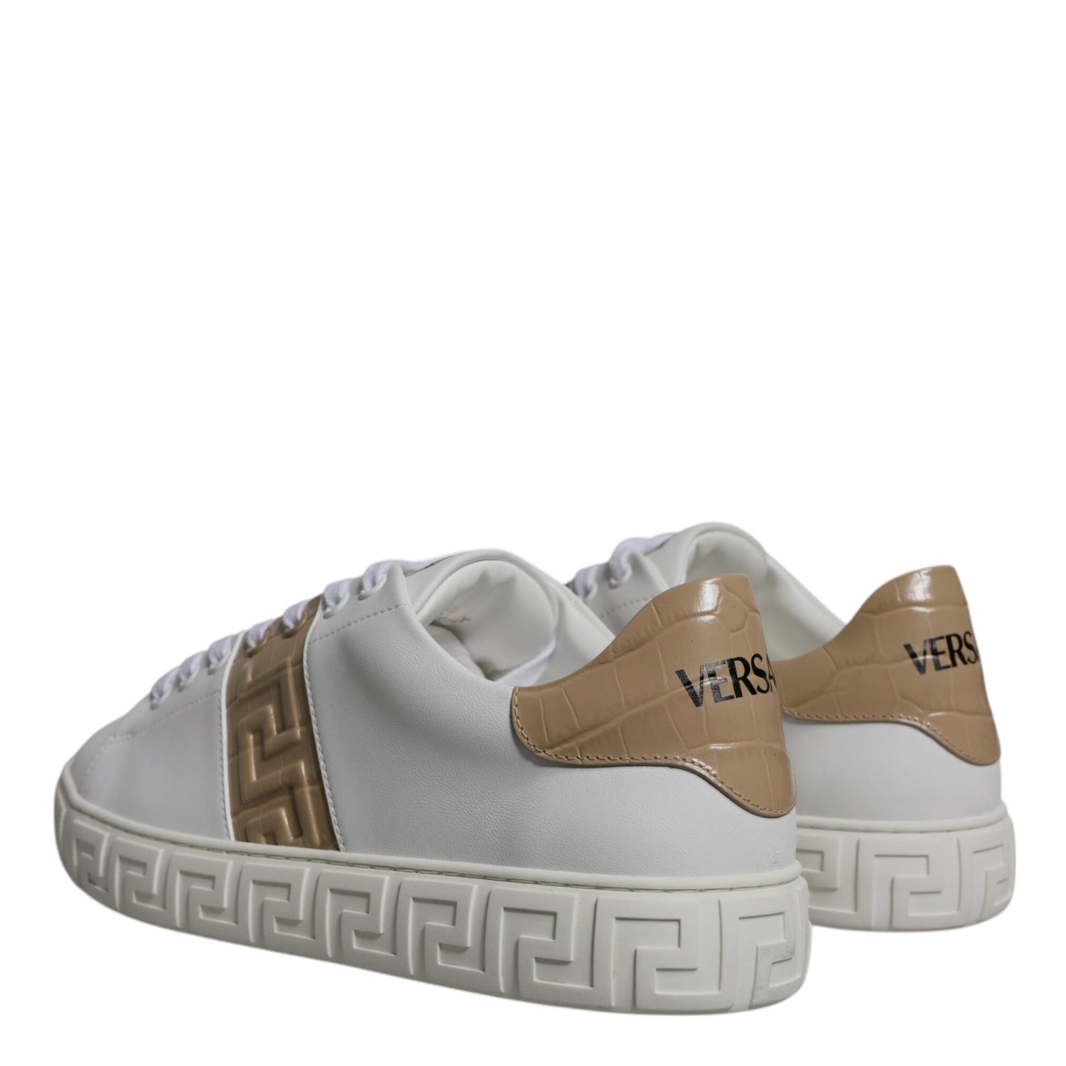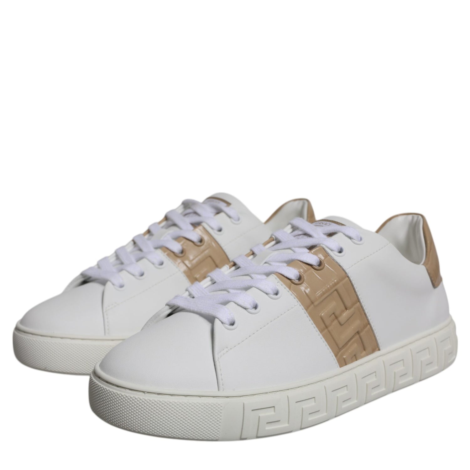 Gorgeous brand new with tags, 100% Authentic VERSACE white/brown leather two-tone design signature Greca detailing logo patch at the tongue almond toe front lace-up fastening platform sole.