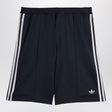 Navy blue stretch twill Bermuda shorts by adidas Originals in collaboration with Wales Bonner, crafted from a nylon and cotton blend, featuring elastic waistband, contrast embroidered logos on hem and back, side stripes, two side pockets, one zip pocket at back, and pressed front pleats.
