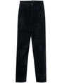 mid-rise twill trousers from COMME DES GARÇONS SHIRT featuring navy blue, cotton, twill weave, mid-rise, belt loops, front button and zip fastening, two side slit pockets, two rear patch pockets and straight leg. Cotton trousers Size and Fit - This piece fits true to size. We recommend you get your regular size. Model is 1,84m / 6ft 1in wearing size M