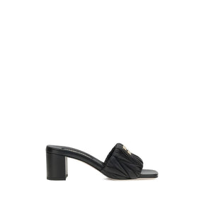 Miu Miu’s lambskin Sandals combine elegance and comfort in a sophisticated design. With a squared toe and padded straps, they are embellished with a metal plaque featuring the iconic Miu Miu monogram on the front. The geometric heel lends a bold, modern touch, while the branded insole adds an exclusive, classy detail.