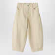 Ivory pants by Il Gufo for girls in stretch cotton gabardine featuring flared legs, button and zip closure, side pockets, topstitched trim, patch pockets on the back, and a practical internal elastic band.