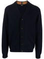 midnight blue merino wool ribbed V-neck front button fastening long sleeves straight hem Wool cardigan Size and Fit - This piece fits true to size. We recommend you get your regular size. Model is 1,84m / 6ft 1in wearing size M