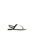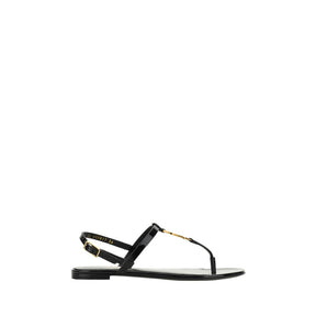 Calfskin Cassandra Sandals by Saint Laurent, flip-flop style, ankle strap closure with side buckle, iconic brand monogram detail embossed on front, logoed insole.