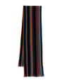 black/multicolour merino wool ribbed knit vertical stripe pattern fringed edge rectangle shape wraparound style Striped scarf Size and Fit - LENGTH: 180.0 Centimetres. WIDTH: 35.0 Centimetres.