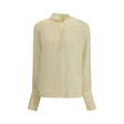 Tom Ford’s silk georgette Blouse is an elegant and sensual piece perfect for special occasions. Featuring a refined high neck, it is distinguished by cut-out details on the front and back, which add a bold and sophisticated touch to the design. The back closure with snap buttons completes the garment discreetly, enhancing the slender and feminine silhouette. An iconic model that combines light transparencies and tailored details, typical of Tom Ford’s decisive aesthetic.
