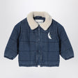 Quilted navy blue denim jacket from Bobo Choses featuring long sleeves, elasticated edges, front zip fastening, sheepskin lining, contrasting collar and embroidery on the chest.