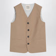 Brown viscose blend Douuod gilet, featuring a V-neck, front button closure, and a back logo patch.