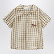Mini Rodini shirt in organic cotton beige with a brown checkered pattern, featuring a front button closure, an applied chest pocket with a dachshund embroidery, and short sleeves.