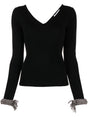braided-cuffs ribbed-knit top from GIUSEPPE DI MORABITO featuring black, merino wool blend, ribbed knit, V-neck, V-back, long sleeves, contrasting cuffs and straight hem. Crystal embellished wool top Size and Fit - This piece fits true to size. We recommend you get your regular size. Model is 1,75m / 5ft 8in wearing size 40 (IT)