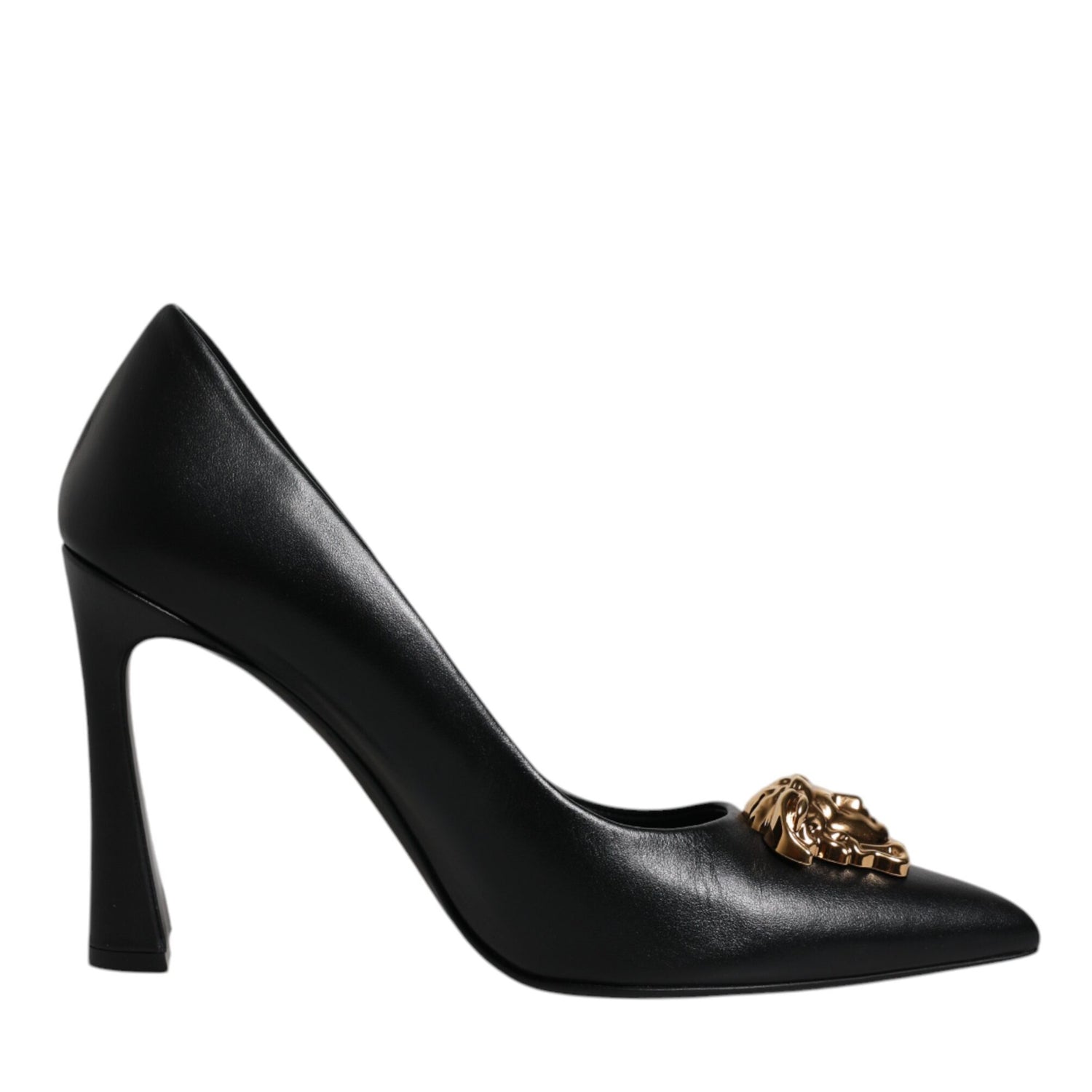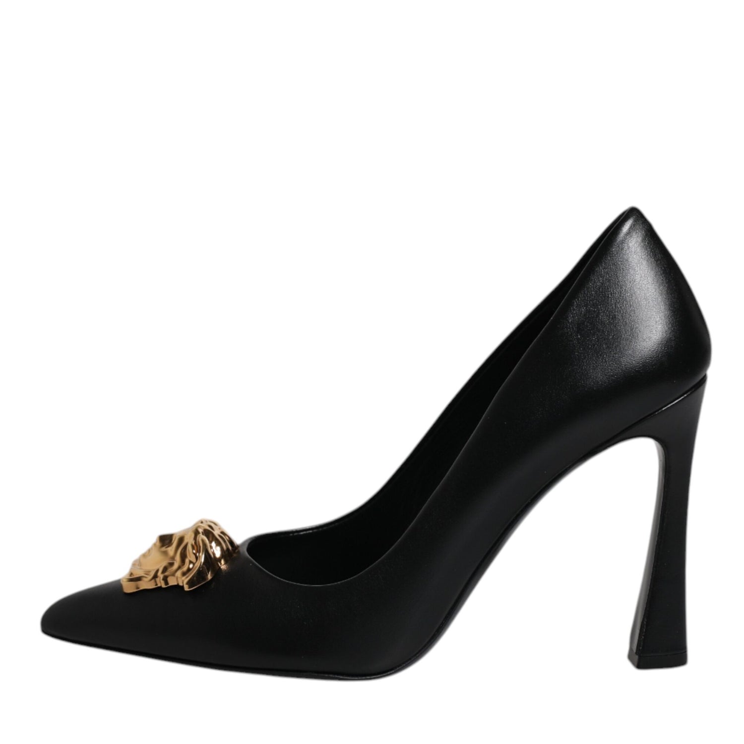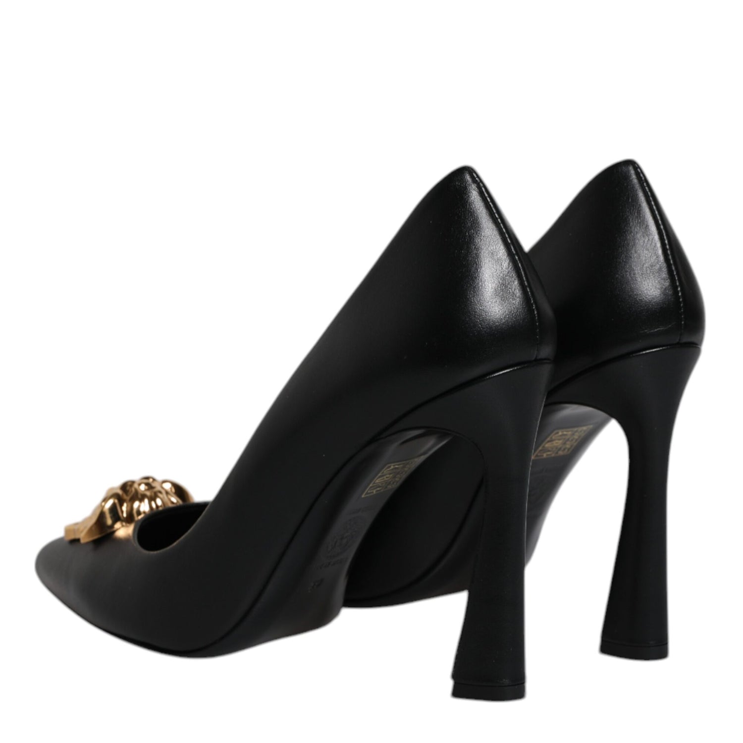Versace Black Leather Logo Plaque High Heels Pumps Shoes