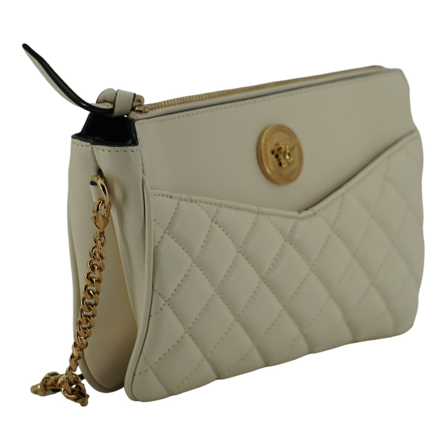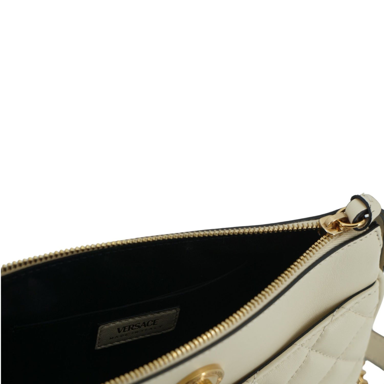 Details: Zip closure, medusa head logo, 1 main compartment, interior slip pocket, external slip compartment, a gold-tone hardware with removable chain and leather shoulder strap for shoulder or crossbody wear.