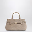 Small hand bag by Manu Atelier in cork-colored suede, characterized by double handles, adjustable strap with buckle, magnetic closure, internal zip pocket with logo, and suede lining. Size and Fit - Width 25 cm x Height 15 cm x Depth 17 cm Handle drop: 15 cm