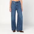Wide jeans by Frame in blue regenerated cotton denim, featuring a front zip and button closure, belt loops, five classic pockets, and visible stitching. Size and Fit - Model wears size 26 Model measurements: Height: 178 cm Chest: 83 cm Waist: 63 cm Hips: 91 cm