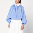 Patou''s light blue cotton shirt with pink and black stripes, characterized by a balloon design, long sleeves with elastic cuffs, a voluminous silhouette with a slightly short cut, a classic collar, and a hidden button closure. Size and Fit - Model wears size 36 FR Model measurements: Height: 179 cm Chest: 82 cm Waist: 65 cm Hips: 90 cm