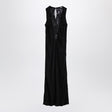 Black viscose sleeveless midi dress from Rotate featuring a deep V-neck with mesh insert, side zip and button fastening at the back. Size and Fit - Model wears size 36 Model measurements: Height: 179 cm Chest: 82 cm Waist: 60 cm Hips: 89 cm