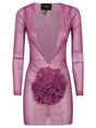 Fuchsia short dress, long sleeves, large flower as a decoration in front, large V -neck, front slit. Flower-applique mini dress Size and Fit - This piece fits true to size. We recommend you get your regular size. Model is 1,75m / 5ft 8in wearing size UNI