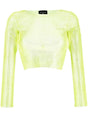 rhinestone-embellished mesh cropped top from Santa Brands featuring lime green, mesh detailing, rhinestone embellishment, semi-sheer construction, round neck, long sleeves and cropped. Long sleeve sparkling top Size and Fit - This piece fits true to size. We recommend you get your regular size. Model is 1,75m / 5ft 8in wearing size S