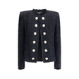 Balmain’s tweed Spencer Jacket is an iconic piece, featuring a round neckline and structured shoulders that define the silhouette. The long sleeves end with straight cuffs decorated with five gold metal "Coin" buttons, while twelve decorative "Gold and Gold Coin" buttons stand out on the front, adding a touch of luxury. The raw cut finish and serge lining complete the design, combining elegance and sophistication typical of the Maison.