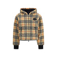 The cropped hooded Check fleece Jacket by Burberry is crafted from a soft cashmere and wool blend knit, featuring the house’s signature Burberry Check in archive beige. Designed with a cropped cut and regular fit, it includes a breathable mesh lining for enhanced comfort. Functional details such as the two-way zip closure, side zip pockets, and drawstrings at the hem and hood meet heritage touches like the silicone Equestrian Knight Design patch at the chest — a nod to an archival emblem from the 1980s.