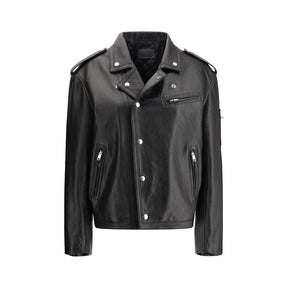 Prada’s Biker Leather Jacket combines a bold and sophisticated design. The snap-button front closure offers practicality and clean styling. Two zippered welt side pockets and a zippered chest pocket add a functional and modern touch, while a zippered sleeve pocket further enhances the garment with useful and stylish details. The classic lapels lend a touch of sophistication, complementing the bold, contemporary look of this leather jacket, ideal for a bold, urban look.
