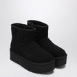 Black suede boots by UGG, featuring round toe, rear pull tab, overlock stitching, sheepskin insole, rear suede patch with logo lettering and rubber platform sole.