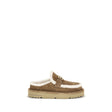 The Après Chic sheepskin Mules by Fendi combine comfort and style in a sophisticated design. Made of brown suede with a tone-on-tone embossed FF pattern, they feature an inner lining and white sheepskin trim that add softness and warmth. The model is embellished with the Baguette detail in gold metal, a distinctive symbol of the Maison. Completing the look is the brown rubber chunky sole with contrasting insert and Fendi lettering on the heel for a bold, contemporary touch.