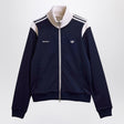 Navy blue stretch twill sweatshirt by adidas Originals in collaboration with Wales Bonner, crafted from a cotton and nylon blend, featuring front zip closure, long sleeves, ribbed knit trims, two side pockets, stand collar, contrast ribbed details, and embroidered logos on the chest.