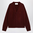 Ami Paris cardigan in cherry color wool and cashmere, featuring a V-neck, front buttoning, tone-on-tone Ami De Coeur embroidery on the chest, long sleeves, and ribbed edges.