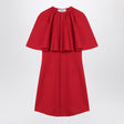 Mini round-neck dress by Ami Paris in virgin wool red, characterized by hidden front buttoning, flared cape design with ruffles and a curved raw-cut hem. Size and Fit - Model wears size 36 FR Model measurements: Height: 178 cm Chest: 89 cm Waist: 62 cm Hips: 88 cm