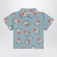 Bobo Choses blue organic cotton denim shirt with Morning Egg all over, featuring short sleeves with one logo embroidery, front buttoning, and a loose fit.