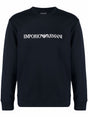 Navy blue modal-cotton blend logo-print crew-neck sweatshirt from EMPORIO ARMANI featuring jersey fleece, logo print to the front, crew neck, long sleeves and straight hem. POSITIVELY CONSCIOUS: This Planet Conscious product contains at least 50% eco-materials, which are independently certified as or widely recognised for having a lower environmental impact.. Logo cotton sweatshirt Size and Fit - This piece fits true to size. We recommend you get your regular size. Model is 1,84m / 6ft 1in wearing size M