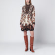 Sand-colored viscose mini dress by Farm Rio featuring contrasting floral motifs, lace details, high neckline, long sleeves, invisible side zip, and front buttoned placket. Size and Fit - Model wears size S Model measurements: Height: 182 cm Chest: 79 cm Waist: 62 cm Hips: 90 cm