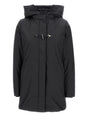 black quilted hood toggle fastening zip fastening long sleeves straight hem layered design Toggle parka coat