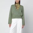 Ganni sweater in green-toned wool blend, featuring wide V-neck, long sleeves, ribbed trims, and small front logo detail. Size and Fit - Model wears size S Model measurements: Height: 178 cm Chest: 83 cm Waist: 63 cm Hips: 91 cm