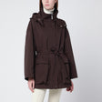 Short coffee-brown natural stretch parka by Herno, featuring silver membrane for breathability, removable hood, drawstring hem, oversized fit, padded lining, high collar, back yoke, flap pockets, long sleeves with buttoned cuffs, matching belt, Laminar logo on the back, and zip with snap-button closure. Size and Fit - Model wears size S Model measurements: Height: 182 cm Chest: 79 cm Waist: 62 cm Hips: 90 cm