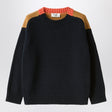 Il Gufo cotton crew-neck sweater with blue, brown, and begonia color-block design, featuring long sleeves and ribbed trims.