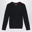 Polo Ralph Lauren black cotton crew neck sweater, featuring long sleeves, cable knit design, and embroidered logo on the chest.