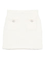 beige tweed texture pearl embellishment button detailing A-line shape Crystal embellished mini skirt