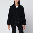 Simkhai jacket in black sherpa, featuring fold-over collar, waist tie belt with straps, two front pockets, long sleeves with turned cuffs, and tone-on-tone faux leather trims. Size and Fit - Model wears size S Model measurements: Height: 178 cm Chest: 83 cm Waist: 63 cm Hips: 91 cm