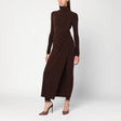 Full jumpsuit by The Andamane in brown stretch jersey, featuring a turtleneck with buttons at the back, open at the back, ruched detail at the side, long sleeves, long leggings, and a maxi skirt with a deep side slit.